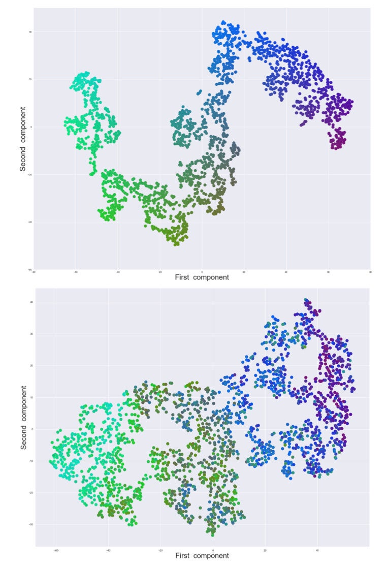 T-SNE representation based on the distance in the space of planetary systems (upper panel) and distance in the space of disc parameters (lower panel). The upper panel is similar to Fig. 8, upper panel, except that the colour code is here only linked to the posi- tion of the point on the plot. On the lower panel, we used T-SNE based on the similarity resulting from the metric in the space of disc parameters to represent systems. The colour code indicates in which part of the upper panel the same system is represented. In the lower panel, two points located close one to the other represents planetary systems formed in similar discs, whereas two points with similar colours represent planetary sys- tems that are themselves similar. Adapted from Alibert et al., (2019),